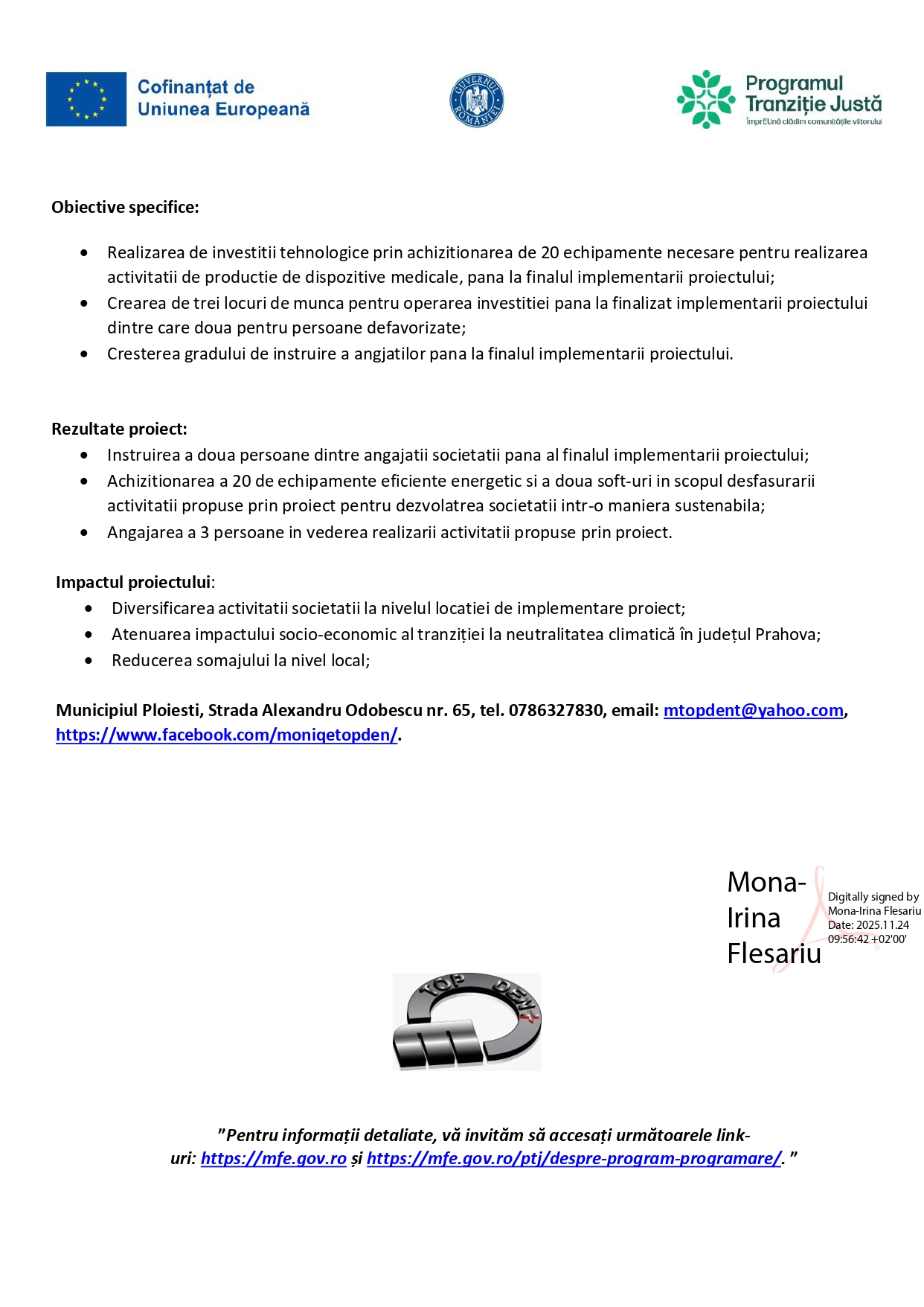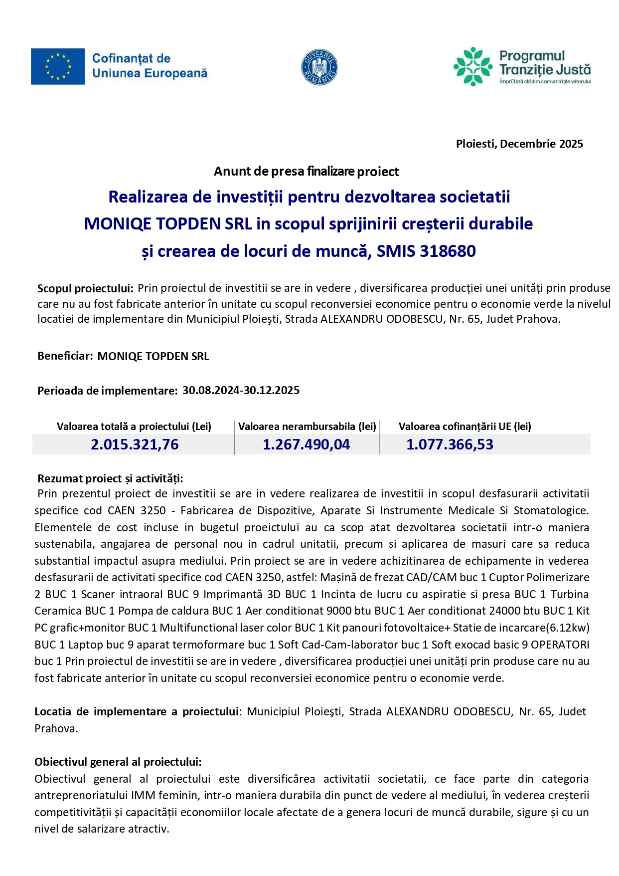 Comunicate de presa Realizarea de investiții pentru dezvoltarea societatii MONIQE TOPDEN SRL in scopul sprijinirii creșterii durabile și crearea de locuri de munca 04/12/2025 Continue Reading Previous Previous post: Digitalizarea Microîntreprinderii Mihamod Optim Accounting SrlNext Next post: Fotbalul – de la distracție de weekend la parte din rutina zilnică